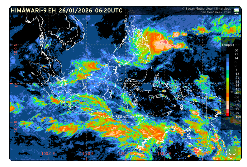 BANYUMASMEDIA.COM – Pantauan citra satelit Himawari-9 Enhanced Infrared (IR) milik Badan Meteorologi, Klimatologi, dan Geofisika (BMKG) pada Senin, 26 Januari 2026 pukul 06.20 UTC menunjukkan masih aktifnya pertumbuhan awan hujan di sejumlah wilayah Indonesia, termasuk Jawa Tengah.