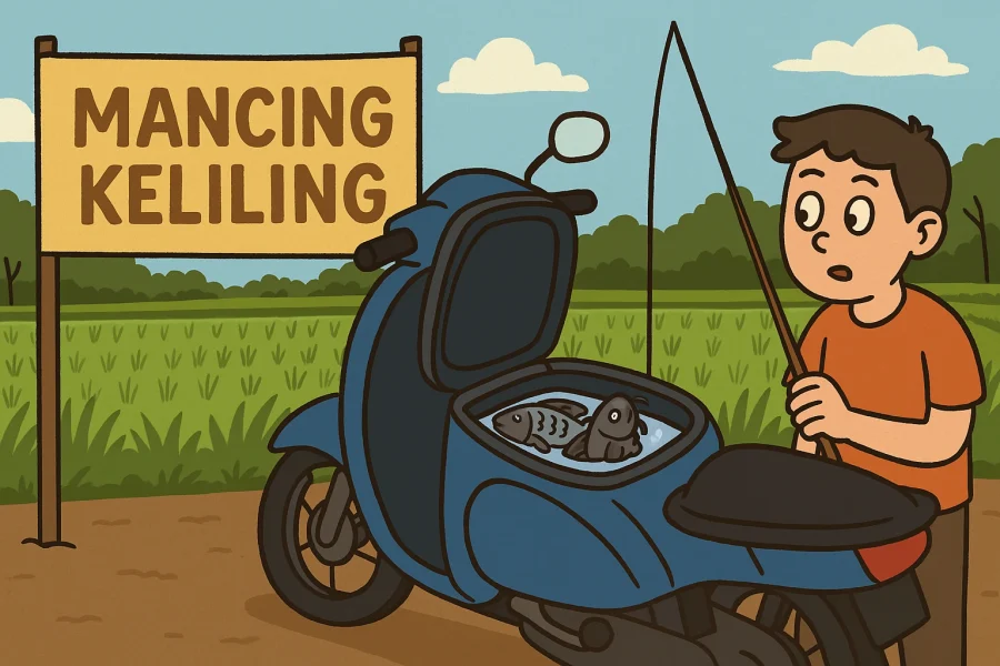 Akun Instagram @folkjog jadi saksi mata betapa absurd dan sekaligus jeniusnya ide ini. Dalam unggahannya, tampak seorang laki-laki sederhana membuka lapak di pinggir jalan, dengan banner mencolok bertuliskan “Mancing Keliling”. Tanpa perlu tempat luas atau kolam buatan, semua “ikan tangkapan” ia letakkan di bagasi motornya. Praktis dan ringkas. Nggak ribet-ribet amat, toh?